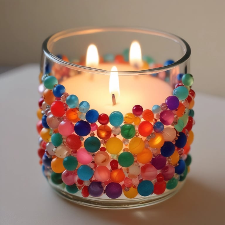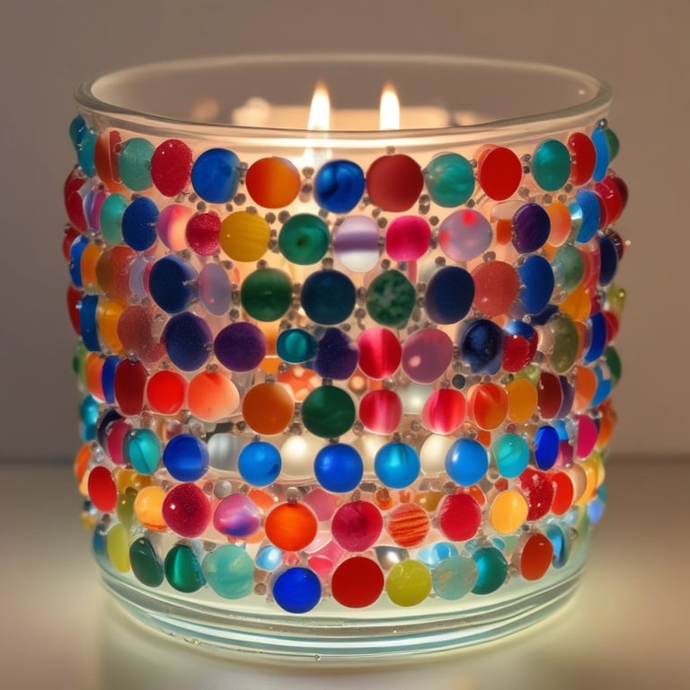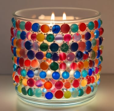 Glue glass pebbles or beads to a glass candle holder for a sparkling, mosaic effect.