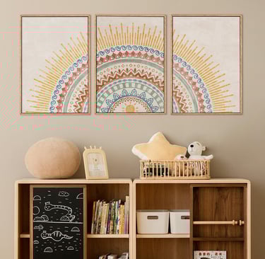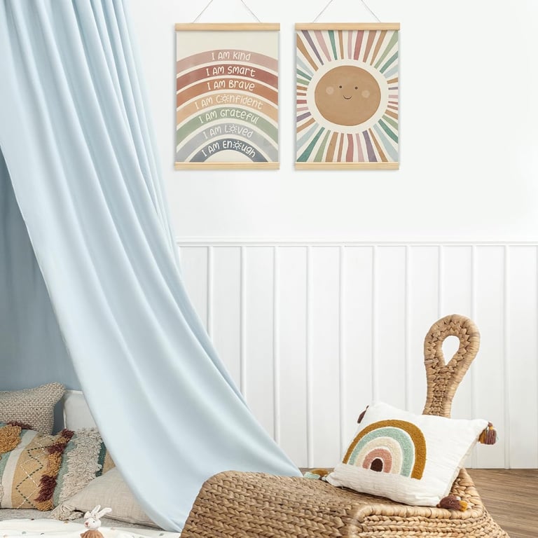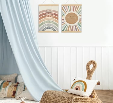 This Boho hanging poster frame adds a unique touch to your space, moving beyond the traditional canvas or picture-in-frame style. It perfectly complements the boho rainbow décor aesthetic you're aiming for.