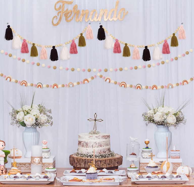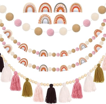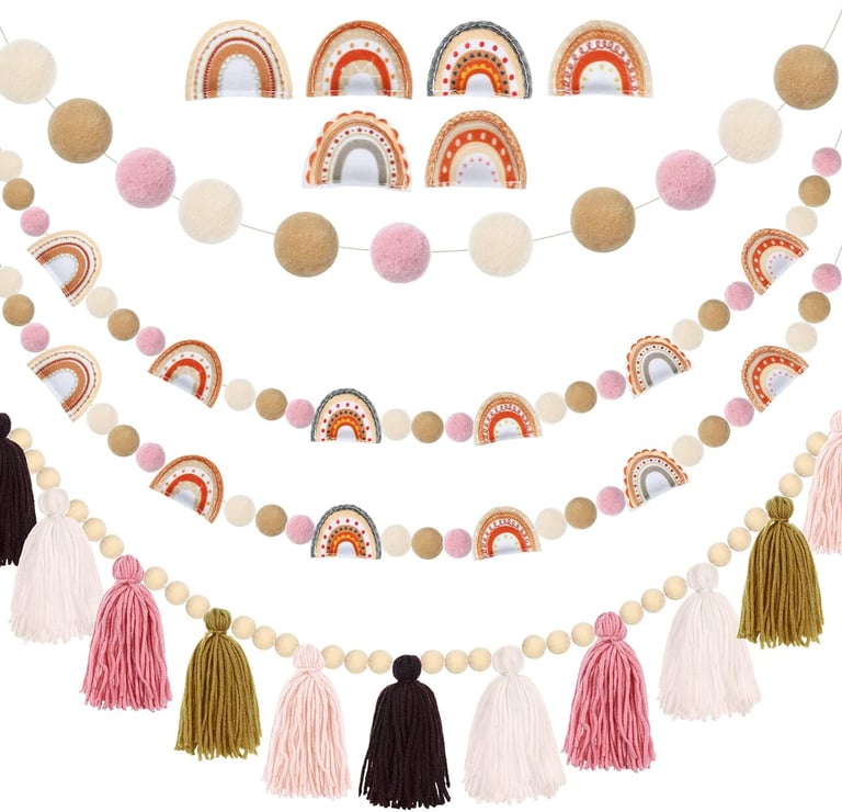 These are designed in 3 different boho styles, including 1 piece tassel garland, 1 piece pom pom garland and 2 pieces rainbow garland banners. They are perfect match for boho rainbow decor for nursery, classroom, birthdays, etc.